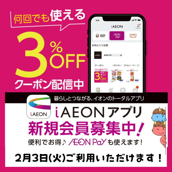 ★iAEONアプリクーポンのご利用で、本体価格からレジにて3%OFF