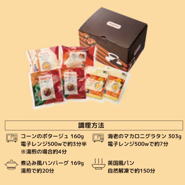 洋食の定番「煮込み風ハンバーグ」、海老の旨みが味わえる「海老のマカロニグラタン」、コーンの甘みを楽しめる「コーンのポタージュ」と、「英国風パン」を詰め合わせました。