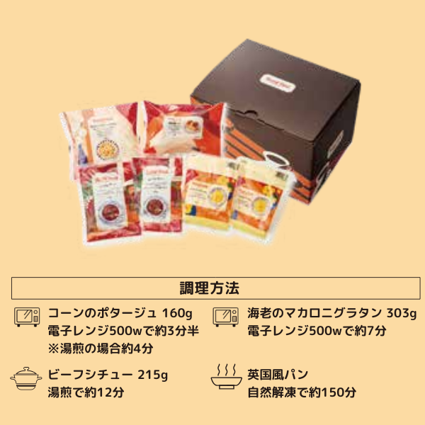 手間を惜しまず仕上げた「ビーフシチュー」、海老の旨みが味わえる「海老のマカロニグラタン」、コーンの甘みを楽しめる「コーンのポタージュ」と、「英国風パン」を詰め合わせました。