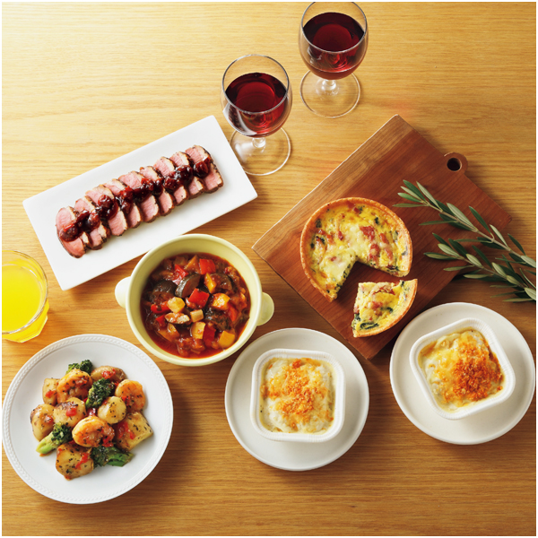 ●内容量:ドフィノワ じゃがいもグラタン(2個入)200g、野菜たっぷりおいしいラタトゥイユ180g、ベーコンとほうれん草のフロマージュキッシュ160g、北海道産帆立と海老のハーブグリル150g、合鴨のロースト いちじく&バルサミコソース220g(合鴨のロースト150g・ソース70g)
