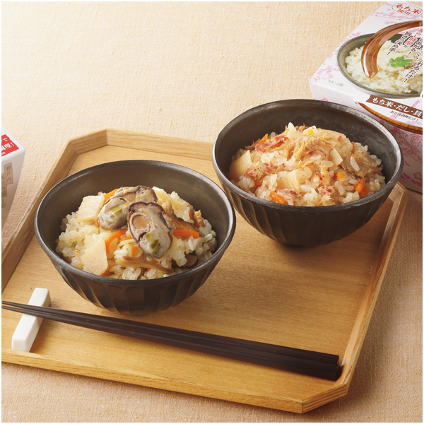 もち米、だし、具材を混ぜ、レンジで温めるだけの簡単調理で、具材の旨みをしっかり含んだご飯が出来上がります。
