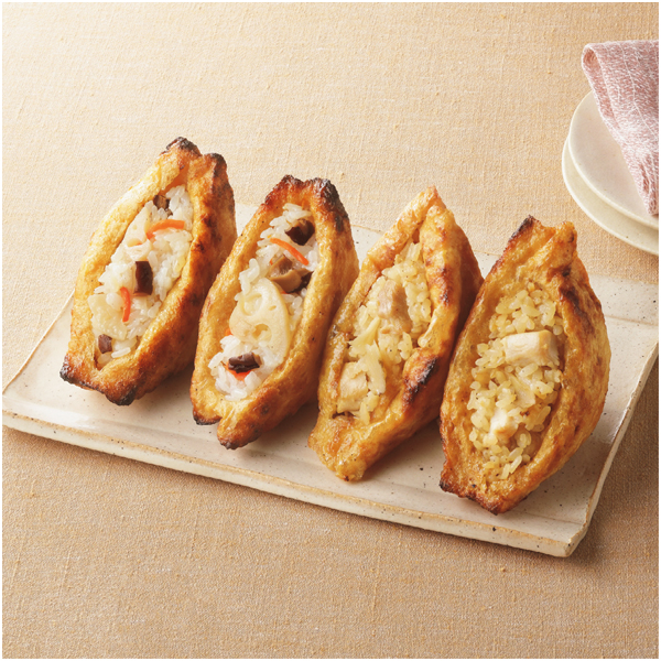 分厚くて大きい油揚げに国産素材使用の寿司飯を詰めた「焼きいなり」。こんがりパリッとした皮の食感と大豆の香ばしい風味が魅力です。