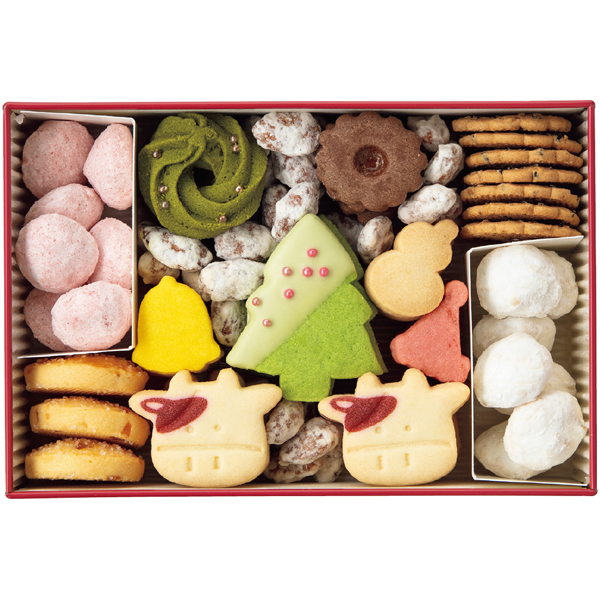 ヨーグルトやホエイなどの味わいを活かしたクッキーです。華やかな缶にツリーやベルなどクリスマスモチーフのかわいい型抜きクッキーを詰合せました。