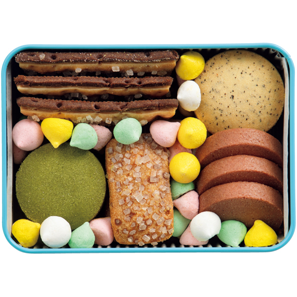 ●内容量:抹茶クッキー、アールグレイクッキー、ラズベリークッキー、パルメザンチーズクッキー、メレンゲ(ホワイト、ピンク、イエロー、グリーン)、パイクッキー 計155g 缶サイズ:9.9cm×13.9cm×4.8cm ※のしはご容赦ください