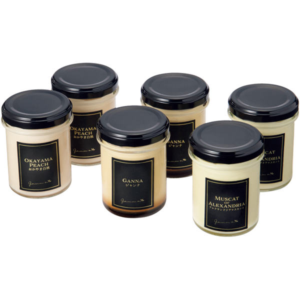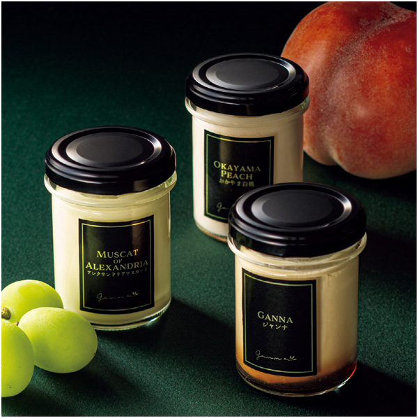 岡山産白桃、マスカットを使用した、トロ~リとろけるフルーツプリンと黒糖と練乳を使用した濃厚な味わいのジャンナプリンの詰合せ。