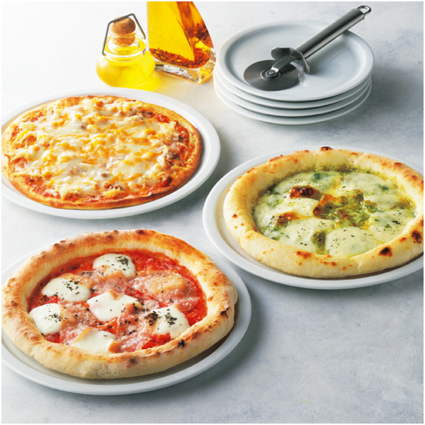 職人が1枚1枚手伸ばしした生地は気泡が入ってもっちりした食感を実現。その生地を窯焼きした、こだわりピザの定番3種をセットにしました。