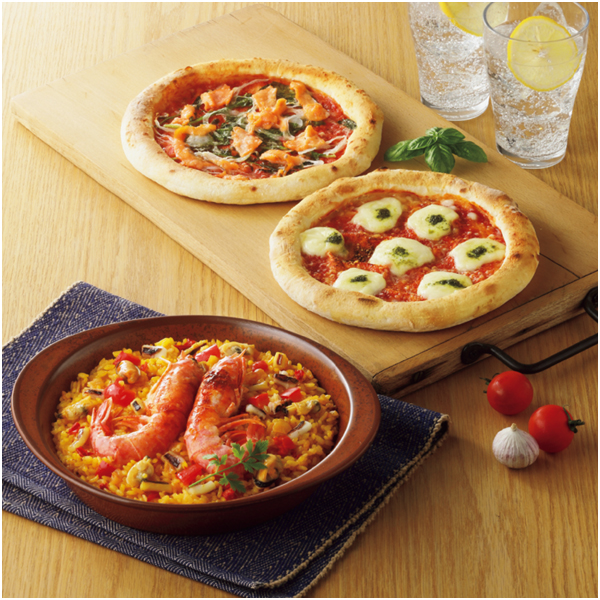森山ナポリ一番人気の「ダブルチーズマルゲリータ」を含むピザ2枚と、土鍋で炊いた旨みたっぷりの「海老と魚介のパエリア」の3点セットです。
