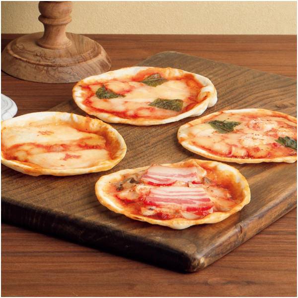 ●内容量:モッツァレラチーズピザ・ニンニクと小エビのピザ・マルゲリータ・信州きのことベーコンのピザ 各直径約11cm×2
