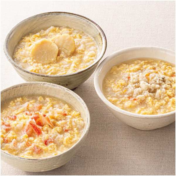 ●内容量:鯛雑炊(鯛飯80g、だし10g、山葵2g、海苔0.3g)2、帆立雑炊(帆立飯80g、だし10g、山葵2g、海苔0.3g)2、かに雑炊(かに飯80g、だし10g、山葵2g、海苔0.3g)2