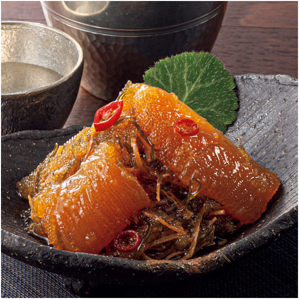 柔らかい数の子を使って、スルメや昆布と漬け込んで仕上げた松前漬です。数の子は食べやすいサイズの「折れ子」を使っております。