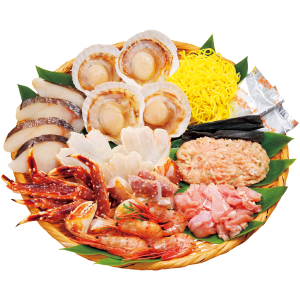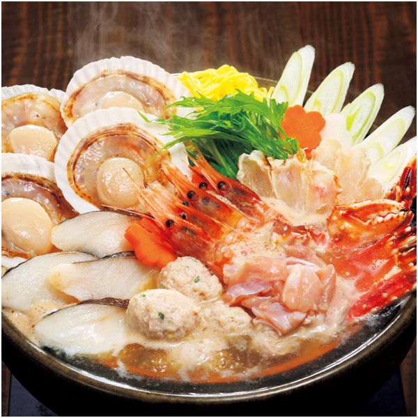 知床どりやほたて・えび等の北海道産の具材を、たらばがにと昆布のだしをとって食べる水炊きセットです。
