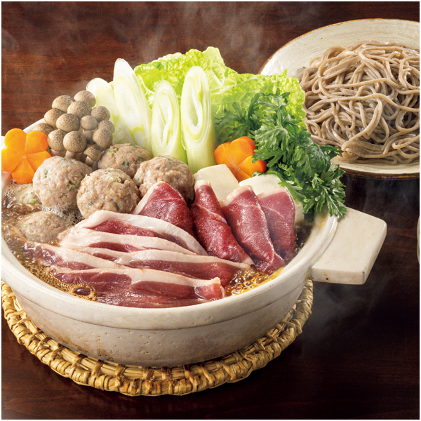 ●内容量:国産あい鴨肉(ロース(むね)120g、もも120g)、京鴨生つみれ(ネギ入り)130g(原料:肉/国産)、ゆでそば170g×2、鴨だし25ml×4