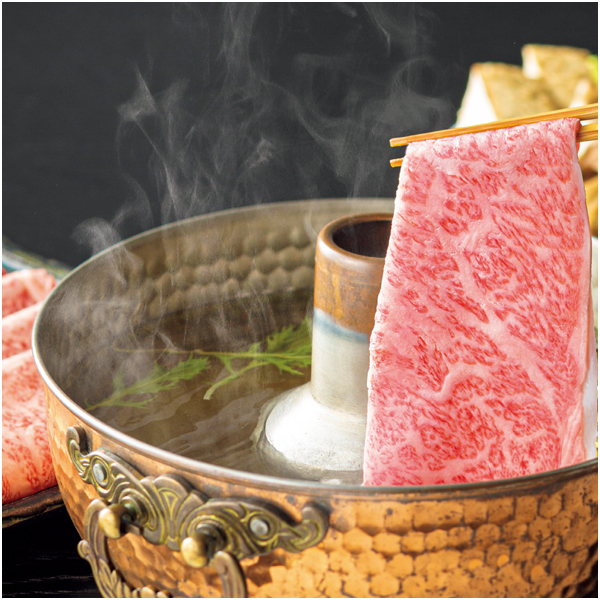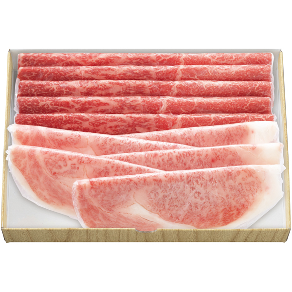 日本三大和牛のひとつ「松阪牛」のロース肉ともも肉をすきやき用としゃぶしゃぶ用にカットしました。すきやきは、スギモト本店監修の割り下がお肉の味をさらに引き立てます。