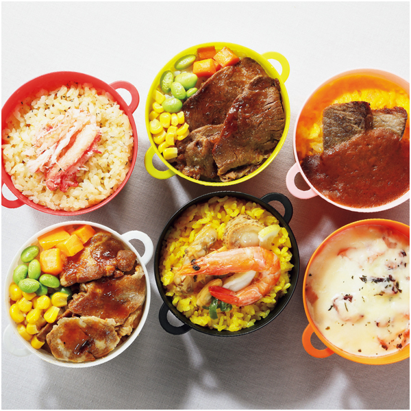 可愛い容器に盛り付けた、6種類の洋食セット。レンジでの簡単調理で召し上がれます。