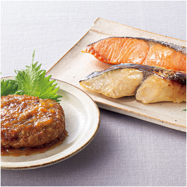 黒毛和牛と黒豚を使った2種類の煮込みハンバーグと西京焼き魚を詰合せました。