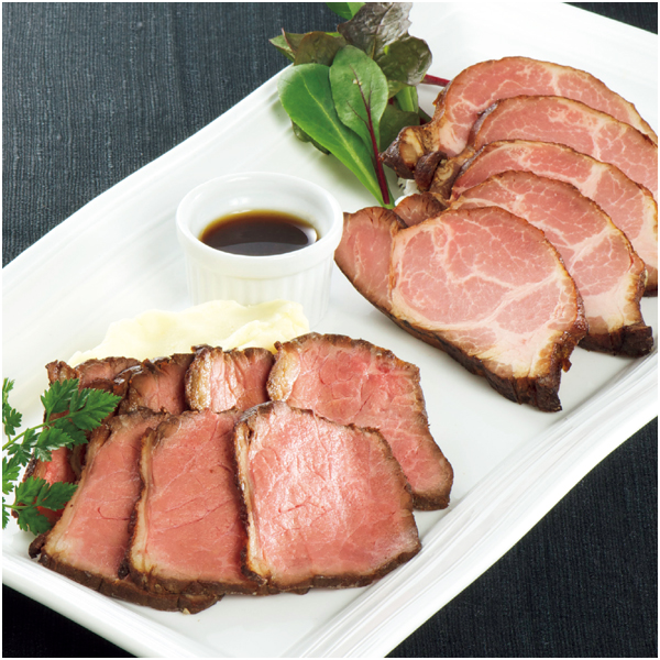 牛もも肉を真空調理で旨みを閉じ込めたローストビーフと真空調理でしっとり仕上げたローストポーク。