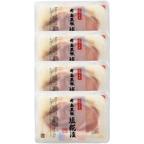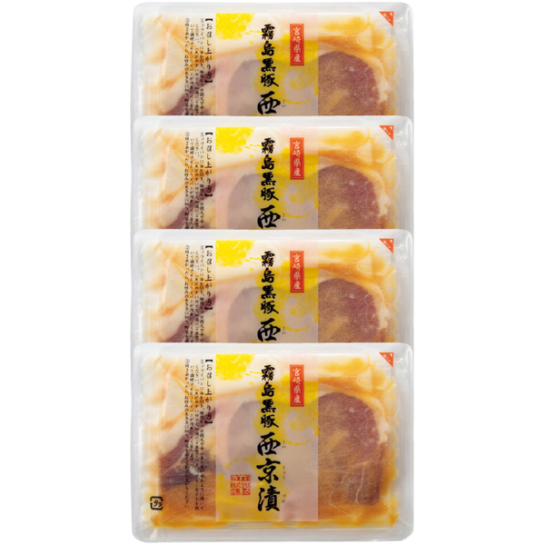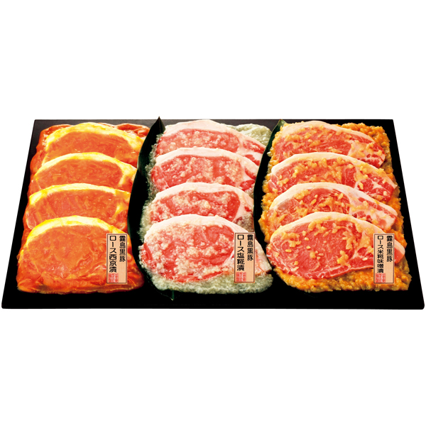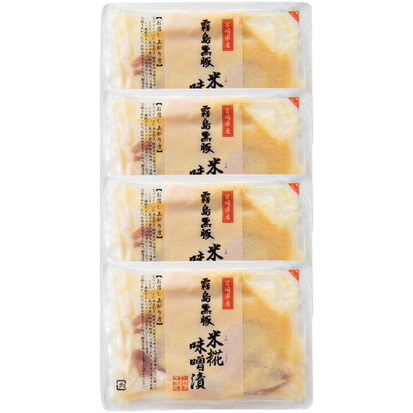 ●内容量:霧島黒豚ロース西京漬け80g×4、霧島黒豚ロース米糀味噌漬け80g×4、霧島黒豚ロース塩糀漬け65g×4(各原料:肉/宮崎県産)