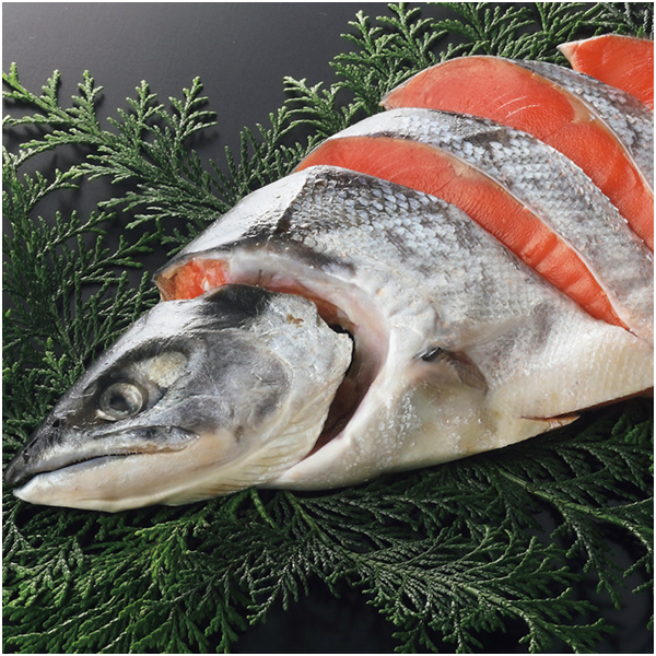 脂ののった紅鮭を海洋深層水を使用した塩水に漬け込んだ後、低温(0から5℃)で48時間熟成させました。