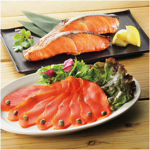 MSC認証の紅鮭を使用し、甘塩味の切身と、北海道産の広葉樹でじっくりと燻製したスモークサーモンを詰合せました。