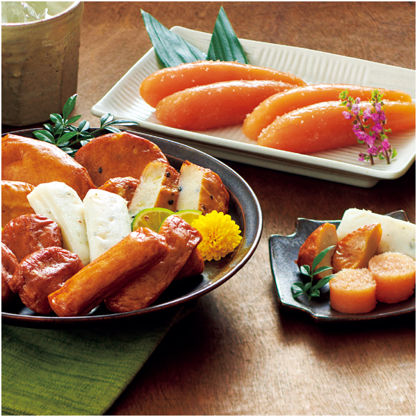 ●内容量:無着色辛子明太子(ロシア産原料)180g、さつま揚げ5袋(ごぼう天4、さつまいも天2、棒天3、上揚げ2、しそ棒天3)