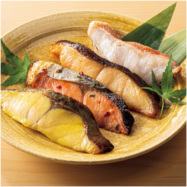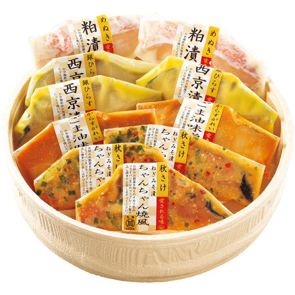 ●内容量:秋さけねぎ味噌漬50g・銀ひらす西京漬50g 各3、めぬき粕漬50g・からすがれいごま油味噌漬50g 各2 計10