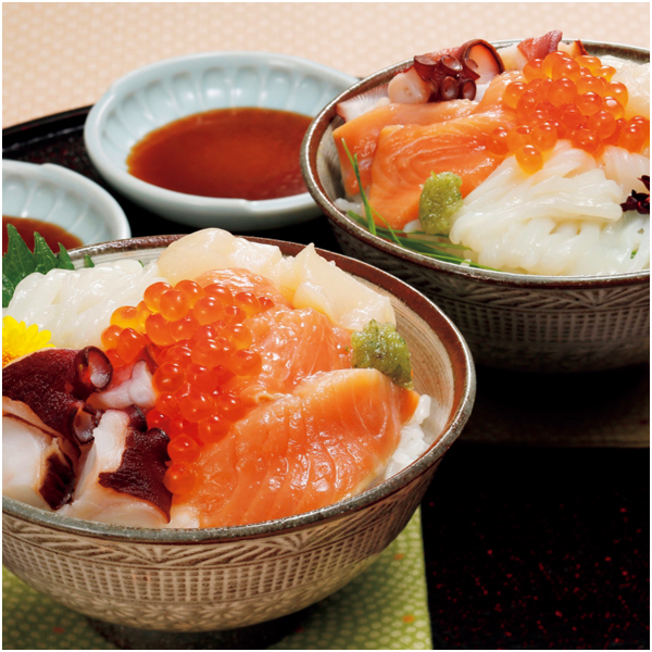 ●内容量:醤油漬いくら・ほたて 各40g、いか・漬け秋鮭さしみ・たこ 各40g×2、海鮮丼のたれ5
