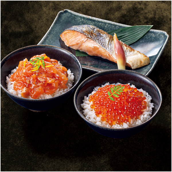 ●内容量:北海道産鮭塩切身80g×3、北海道産鮭さざ浪漬(鮭の塩糀漬)70g×3、鮭ルイベ漬60g×2、いくら醤油漬60g