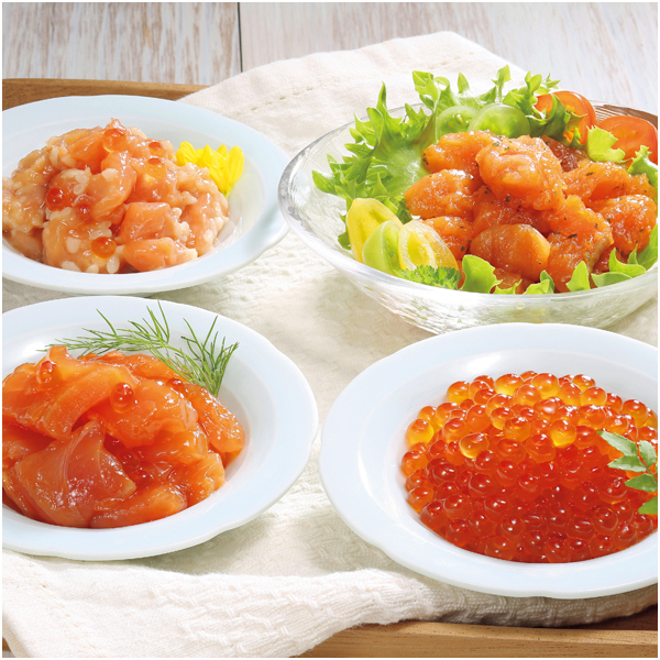 人気の鮭ルイベ漬をはじめとした、北海道産秋鮭の珍味3種と、特製たれで漬け込んだいくらの、北海道鮭親子の詰合せです。