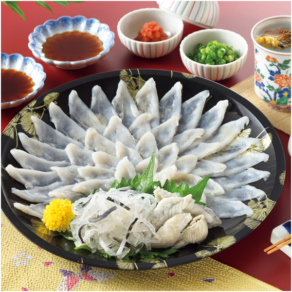 ●内容量:天然とらふぐ刺身70g、天然とらふぐ身皮50g、特製ポン酢150ml、もみじおろし10g×4、ひれ酒用とらふぐ焼きひれ5g