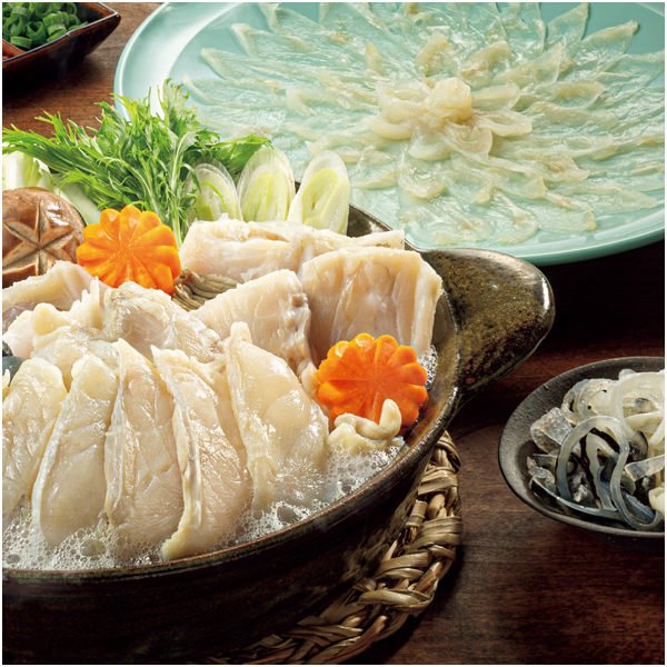 ●内容量:天然トラフグ刺身80g(プラ皿)、天然トラフグ皮刺し50g、天然トラフグちり500g(身130g、アラ370g)、ポン酢250ml、鍋だし55g、もみじおろし5g×4