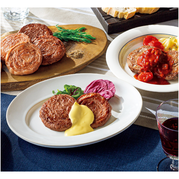 タスマニアビーフとナチュラルポークのロールステーキをセットでお届けします。