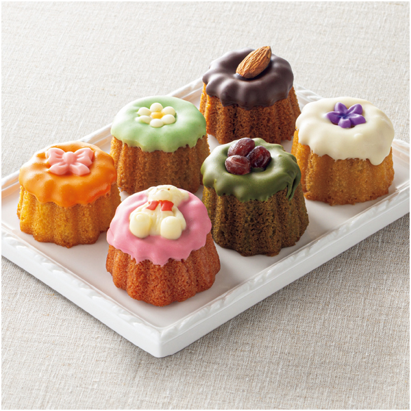 カヌレ型の6種の焼菓子。一つひとつカップに入れたトッピングがキュートです。