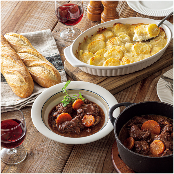 ●内容量:ジャガイモのクリームグラタン(大袋)900g、牛肉の赤ワイン煮420g(2・3人用)、ミニバゲット260g(2本入)