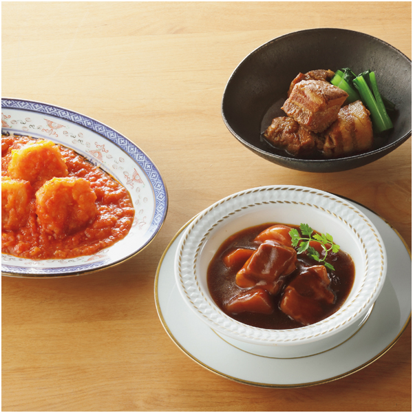 ●内容量:橋本シェフ監修豚角煮、橋本シェフ監修いわしの生姜煮、田村シェフ監修海老チリソース煮、田村シェフ監修四川風麻婆豆腐、日髙シェフ監修デミグラスソースハンバーグ、日髙シェフ監修ビーフシチュー