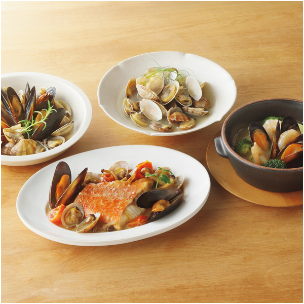 ●内容量:骨取り赤魚のアクアパッツァ180g×2、えびとムール貝のアヒージョ175g、ムール貝とあさりの白ワイン蒸し220g、あさりの酒蒸し240g 計5