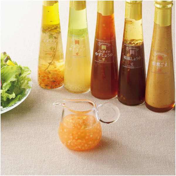 ●内容量:ドレッシング(イタリアンハーブ・フレンチガーリック・ノンオイルゆずしょうゆ・ノンオイル大根と人参・和風しょうゆ・焙煎ごま)各122ml