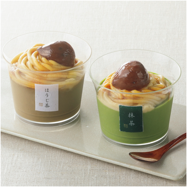 ほろ苦い香り豊かな抹茶プリンと、まろやかで香ばしいほうじ茶プリンをセットで。