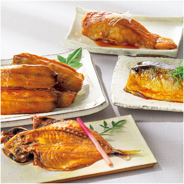 ●内容量:真あじ醤油干し40g×4、にしん蒲焼140g・金目鯛煮付け100g・さば照焼110g 各2(個包装)