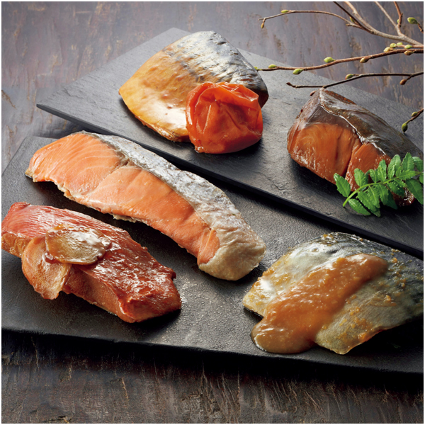 ●内容量:ぶりの照焼き90g・さばの味噌煮90g・金目鯛と黄金生姜の煮付け100g・さばと南高梅の煮付け110g・紅鮭の塩焼き60g 各2 計10(個包装)