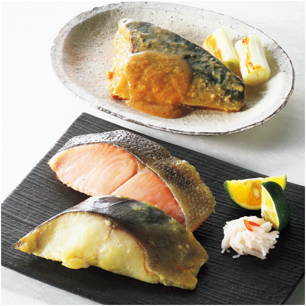 ●内容量:銀だら西京焼・銀鮭塩焼・鮭塩焼・鯖塩焼・赤魚西京焼・ぶり西京焼 各50g、鯖味噌煮50g×2 計8