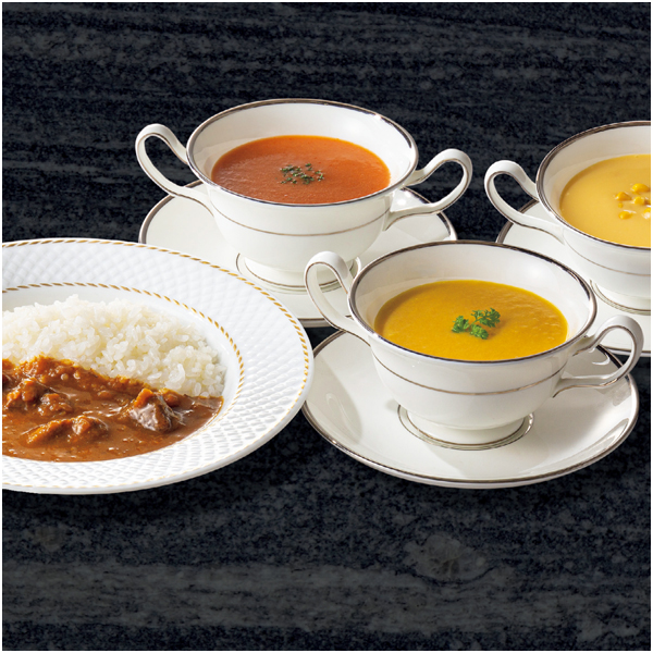 帝国ホテル伝統のビーフカレーと3種類のレトルトスープのセットです。
