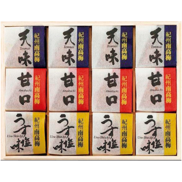 和歌山県紀南地方産の梅のみを使用した3種類の異なる味の梅干を1粒ずつ丁寧に個包装にし、木箱に詰めました。