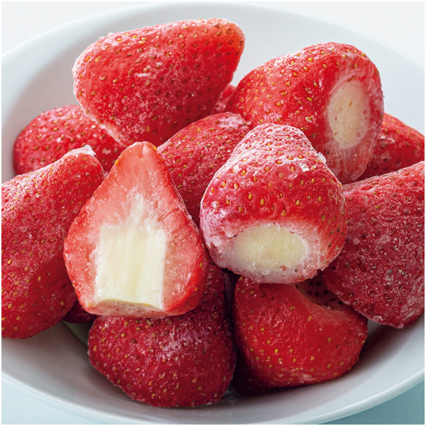 苺の芯を丁寧にくり抜き、練乳と生クリームを使ったアイスを絞り入れました。