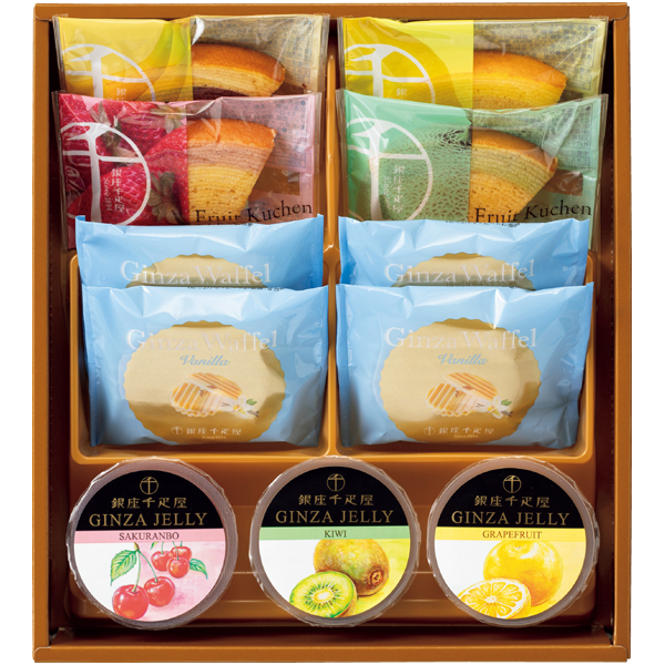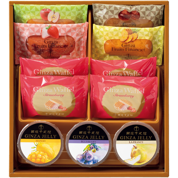 ●内容量:銀座ゼリー(ラ フランス・マンゴー・キウイ・グレープフルーツ・ブルーベリー・さくらんぼ)各75g、銀座フルーツフィナンシェ(ストロベリー、パイナップル、アップル、マロン)、銀座ヴァッフェル(バニラ・いちご)各4、銀座フルーツクーヘン(イチゴ&ミルク、レモン&はちみつ、メロン&ミルク、バナナ&チョコ)