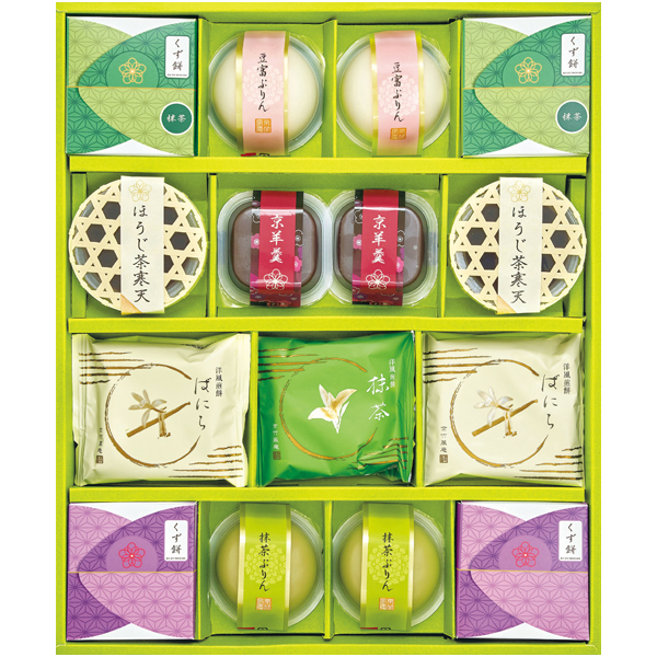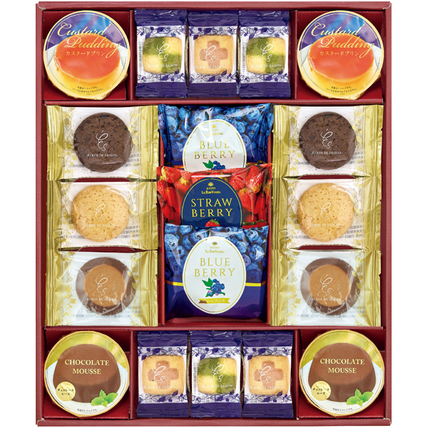 ●内容量:カスタードプリン75g×2、チョコムース75g×2、モザイククッキー(バニラ&イチゴ6、バニラ&抹茶6、チョコ&ブルーベリー4)、クッキー(チョコチップ・ココナッツ)各4、ヴァッフェル(ブルーベリー2、ストロベリー)、ほうじ茶寒天72g×2、くず餅(黒みつ付き)72g×2、くず餅抹茶(黒みつ付き)72g×2、京羊羹64g×2、ぷりん(抹茶・豆富)各64g×2、洋風煎餅(ばにら4、抹茶2)