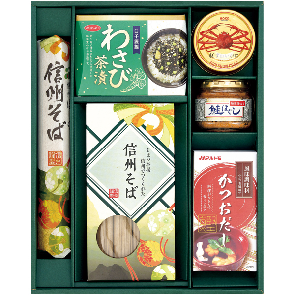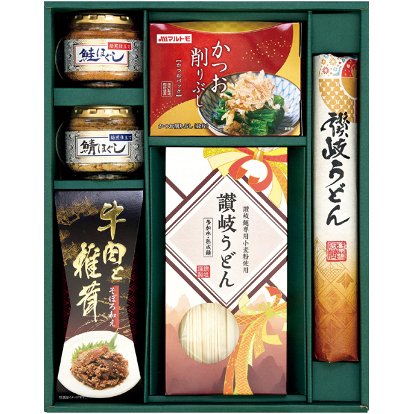 ●内容量:讃岐うどん(320g、180g)、信州そば(280g、180g)、牛肉と椎茸のそぼろ和え55g、紅ずわいがにほぐし身55g、鮭ほぐし40g×2、鯖ほぐし40g、白子のりわさび茶漬3.3g×3袋、マルトモ(かつお削りぶし1.5g×4袋、かつおだし8g×5袋)