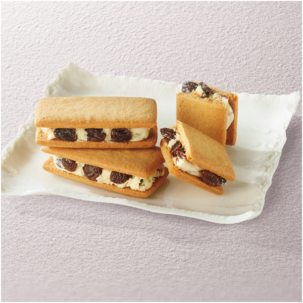 ホワイトチョコレートとレーズン、北海道産生乳100%のバターをあわせたクリームをビスケットで挟んだ人気商品です。