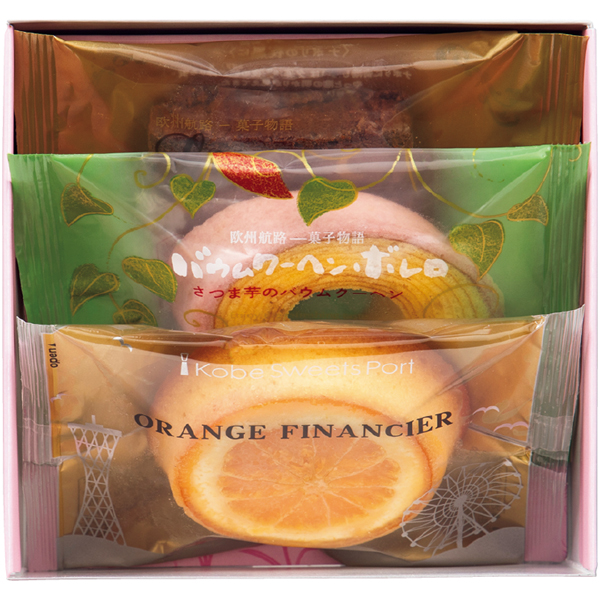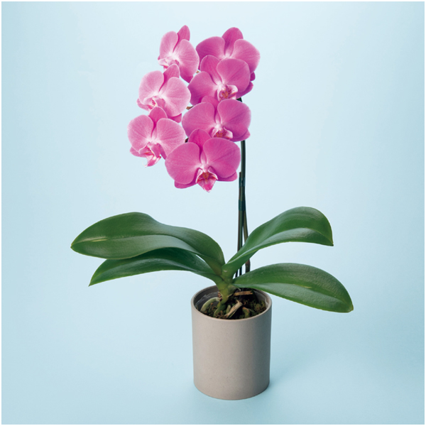 ピンクの花弁の中心がほんのり白い、愛らしい色合いが目を引く胡蝶蘭です。お母さんへ、ありがとうの心を届けます。爽やかなオレンジフィナンシェと、さつま芋の風味広がるバウムクーヘン、しっとり食感のガトーショコラをセットに。