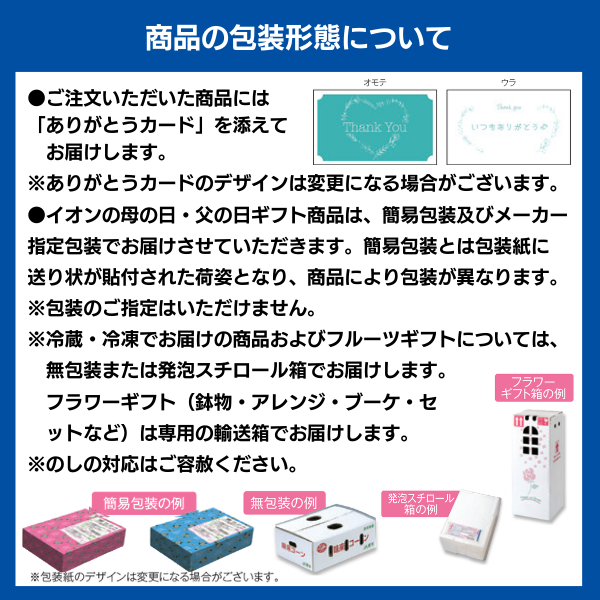●包装形態:イオンの母の日・父の日ギフト商品は、簡易包装及びメーカー指定包装形態でお届けさせていただきます。