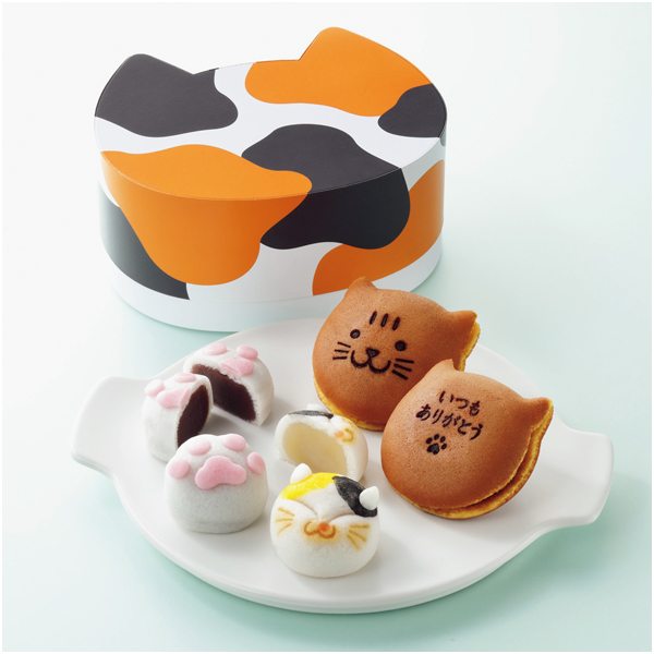 ほのぼのとした表情の三毛猫のどら焼きと饅頭に、かわいい肉球饅頭もセット。お茶の時間をほっこり和ませてくれます。